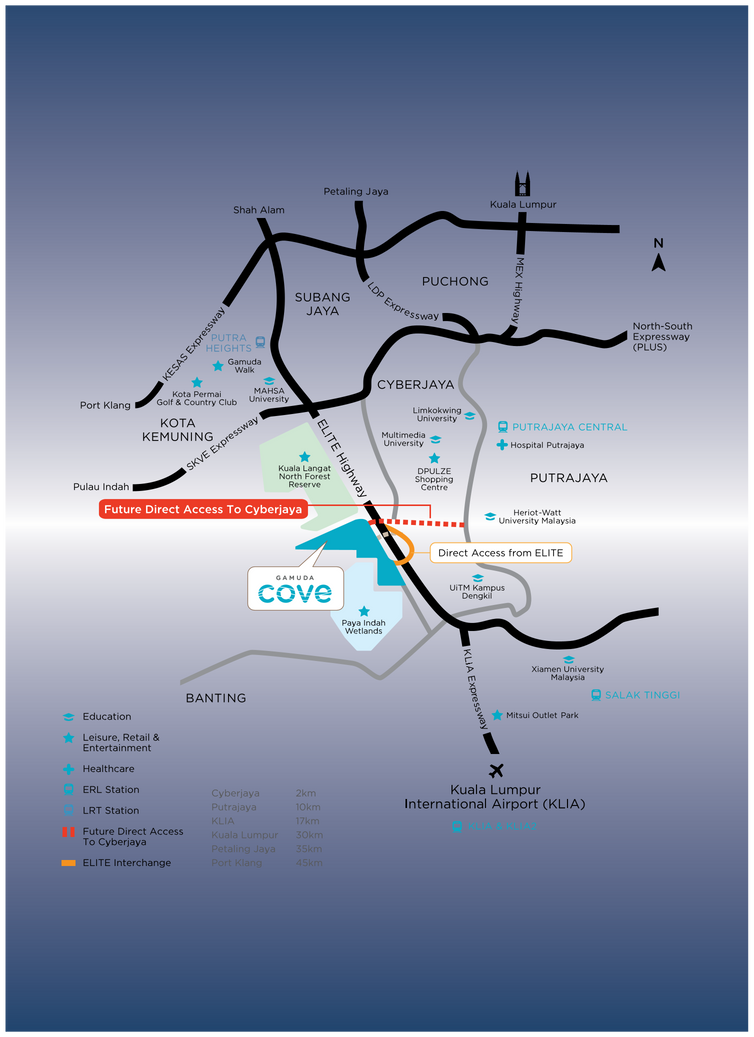Set next to wetlands and forest reserves in Southern Klang Valley, Gamuda Cove is a 1530-acre township complete with lifestyle amenities, residences, parks, international school, placemaking and ecotourism venues and many more. Besides the direct Elite highway access, Gamuda Cove will also have a direct 2km link to Cyberjaya, reducing time travel to only 5 minutes and simultaneously, bringing KLIA to an even closer proximity - making this township a truly desirable destination.